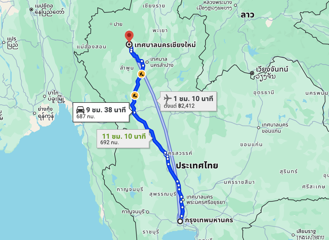 - การเดินทางด้วยรถทัวร์จากกรุงเทพฯ ไปเชียงใหม่จะใช้เวลาประมาณ 9-12 ชั่วโมง ขึ้นอยู่กับเส้นทาง สภาพการจราจร และการหยุดพักระหว่างทาง